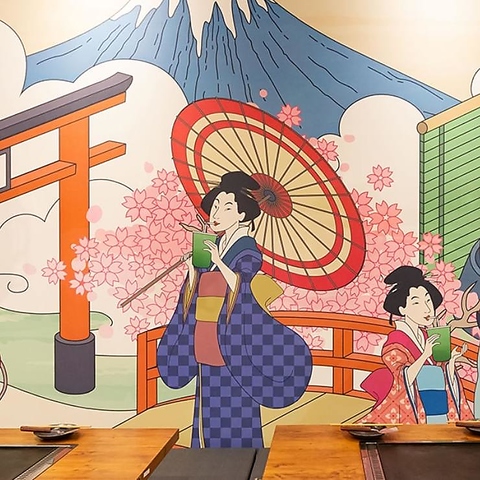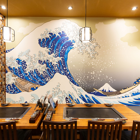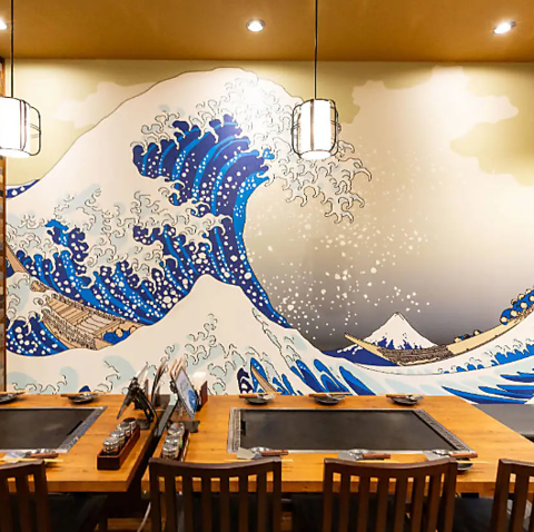 日本の魅力を詰め込んだ、遊び心たっぷりの空間。富士山や鳥居、桜が描かれた浮世絵風アートが壁一面に広がり、店内に一歩入れば“和”の世界が広がります。各テーブルには鉄板を完備。落ち着いたテーブル席で、目の前で焼き上がる料理をゆっくり楽しめます。