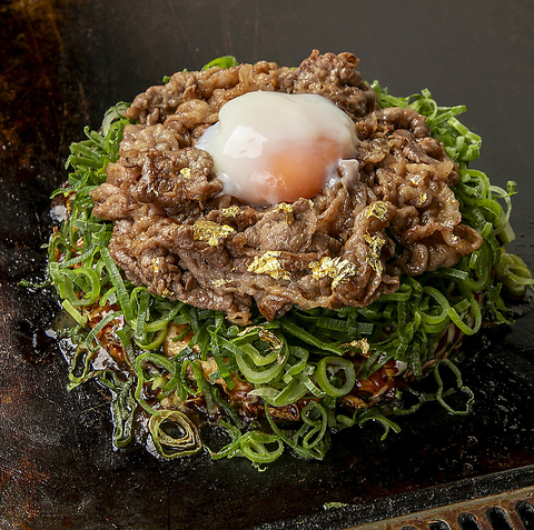 贅を尽くした究極のお好み焼き、「THE WAGYU」が登場!神戸牛をたっぷりと使用し、旨みととろけるような食感を存分に味わえる一品です。たっぷりのネギがさっぱりとしたアクセントを加え、さらに豪華に金箔をあしらって特別感を演出。見た目も味もワンランク上の贅沢を♪ ●神戸牛すじ・和牛切り落とし・青ねぎ・温泉卵・金箔