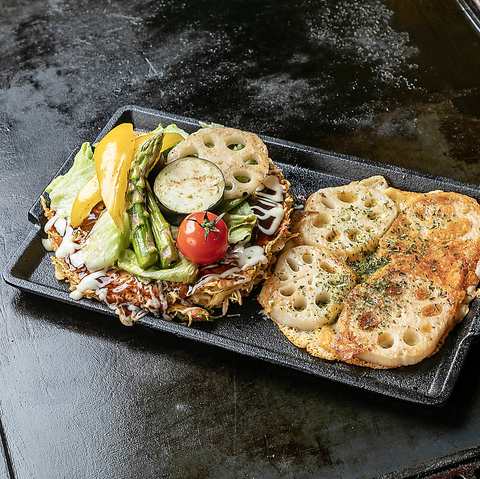 ヘルシー志向の方にぴったりな「ベジタブルコンボ」!彩り豊かな焼き野菜がたっぷりのったベジタブル玉と、シャキシャキ食感のレンコンにとろ-りチーズを合わせたレンコンチーズの贅沢な組み合わせです。野菜も一緒に食べたい人におすすめ! ●ベジタブル玉・レンコンチーズ