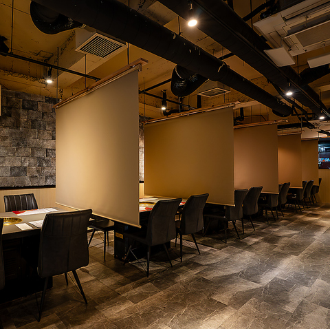 【半個室対応】ロールスクリーンで仕切られた静謐な空間は、少人数のご会食から団体利用まで柔軟に対応。7名様以上で完全個室としてもご案内可能です。