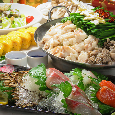 当店人気NO1♪お刺身の盛り合わせと絶品もつ鍋、串焼が一緒に味わえるちょっと贅沢なコース内容となっております。プリプリのもつは歯切れがよく、旨味の詰まったスープは心と身体を温め、疲れを癒してくれます。味・ボリュームともに大満足いただける内容となっておりますので是非各種の宴会お使いください。