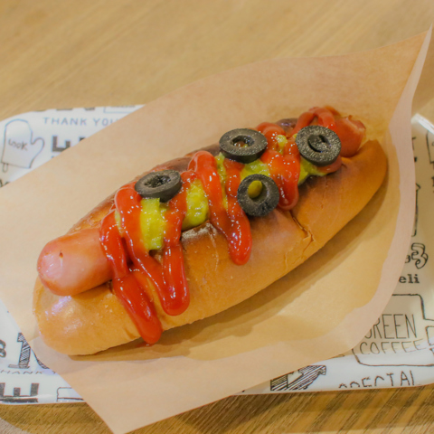 トースターでカリッと仕上げたパンにオリーブとレリッシュマスタードをふんだんに使用したホットドッグ。