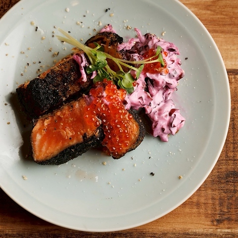 黒を基調とした当店名物「サーモンレアカツ」は是非お召し上がりいただきたい逸品です。サクサクな衣のレアカツはお酒の進む逸品となっております。食材を贅沢に使用した名物は大切なお食事のシーンを豪華に彩ります。数に限りがあり品切れ続出のメニューでございますので、お早めのご注文をお願いいたします。