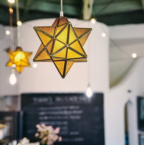 美しいランプは、柔らかな光を放ち、リラックスした雰囲気を演出します。特に夜になると、その輝きが空間を一層魅力的に彩り、訪れるお客様に特別な体験を提供します。カフェからバルへと変わる空間の雰囲気を引き立て、居心地の良いひとときを演出します。星のように輝く光の下で、素敵な時間をお過ごしください。