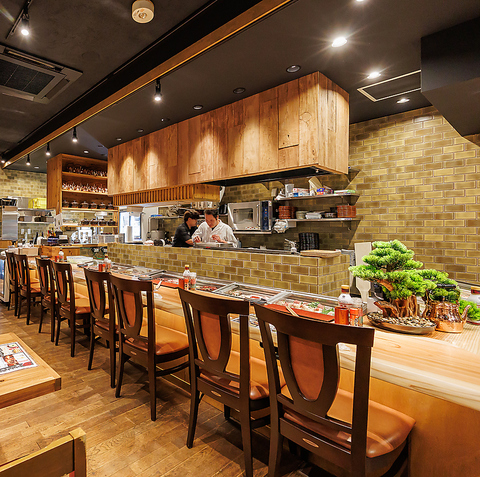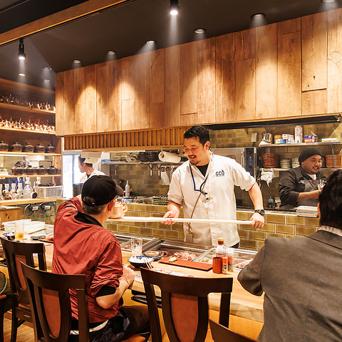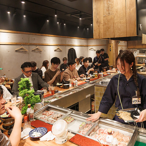 【カウンター席有り!】カウンター席は12名様までの特等席。壮観オープンキッチンのため、焼き場、板場のどちらも見ることが出来き、目線の高さに合わせた設計。目の前のネタケースにはその日に串打ちしたばかりのネタがズラリとならんで目を愉しませてくれます。お一人様、カップル、お友達同士などお気軽にお使い頂けます