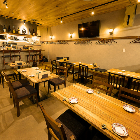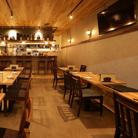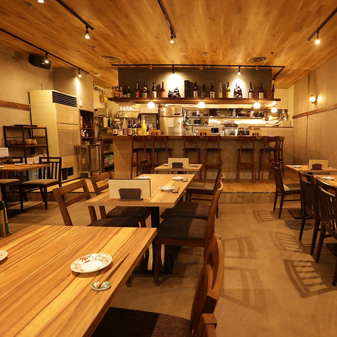 店内木目を基調とした落ち着いた空間が広がっています。お仕事帰りにふらっとお立ち寄りいただけます。デートや宴会、女子会などにも最適です。貸切も可能なので大人数でのご利用もお気軽に店舗までお問い合わせくださいませ。