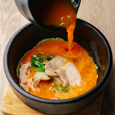 じゅわ~っと香ばしい! 石焼き鍋で仕上げた鹿児島黒豚カツに、とろとろ卵がとろける至福の一杯。