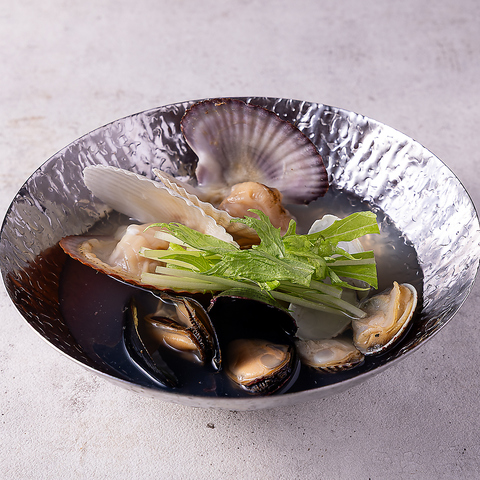 贅沢に獺祭を使用した酒蒸しです。獺祭がもつ芳醇な香りと、貝から溢れる旨味のコンビネーションが最高です。