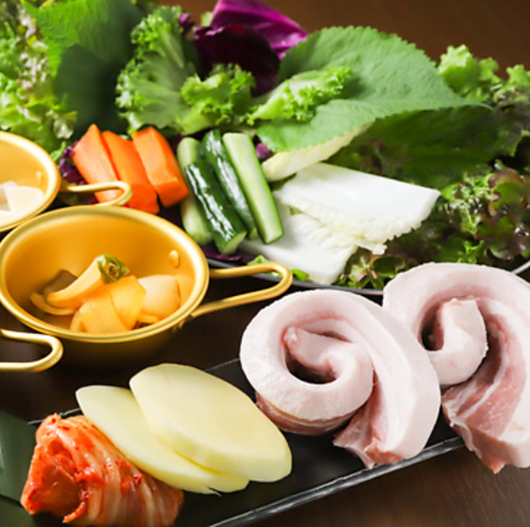 当店イチオシの「サンパセット」は、野菜にご飯と特製味噌薬味「サムジャン」を乗せ包んで食べる料理です。8種類の旬の野菜と日替わりのおかず、お肉がセットになっています。野菜と一緒に食べるためヘルシーで、健康志向の方にも最適な一品。お肉は数種類から選べ、特に鹿児島県産の冷凍していない生豚肉を用いたサムギョプサルがお勧めです。