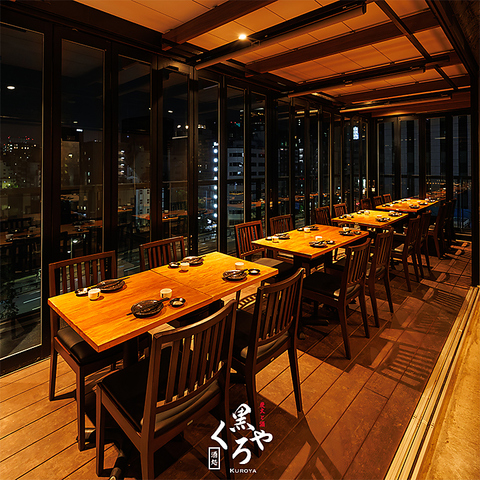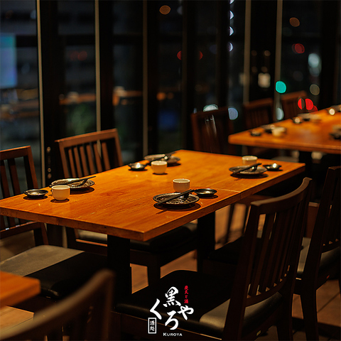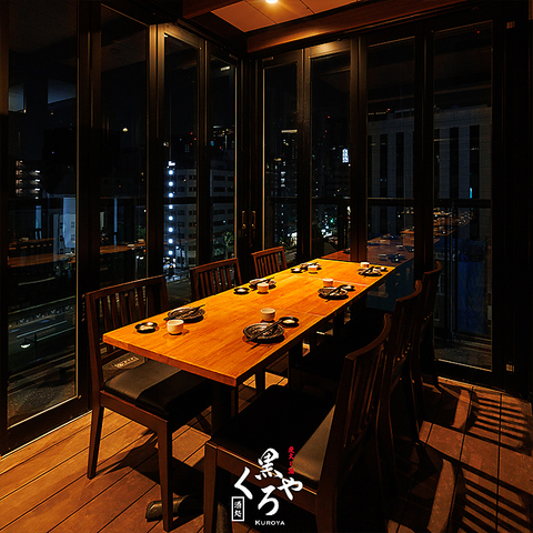 [3~6名様]外の景色を一望できる、都会の喧騒を忘れさせる空間。木目のテーブルが醸す温もりと、ガラス越しに広がる煌めきが、心を満たすひと時を演出します。大切なご接待や会食など、特別な夜にぜひ。