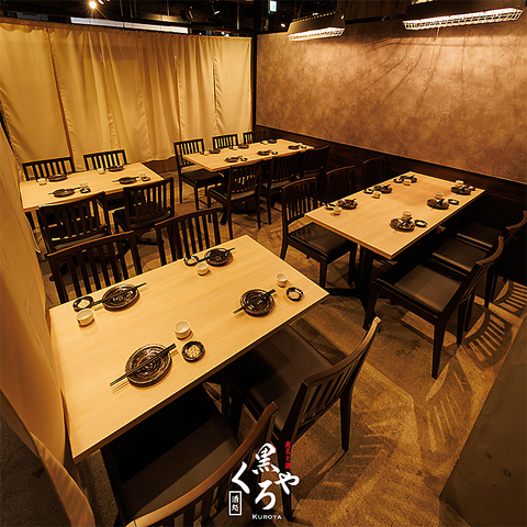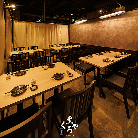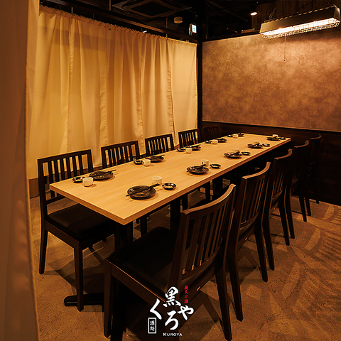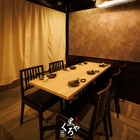 落ち着いた色合いと木目のテーブルが織り成す空間が心を静かに整える設え。カーテンで仕切られた程よいプライベート感は、会社宴会や歓送迎会など、大人数のご利用にも最適。大人なひと時をお届けします。