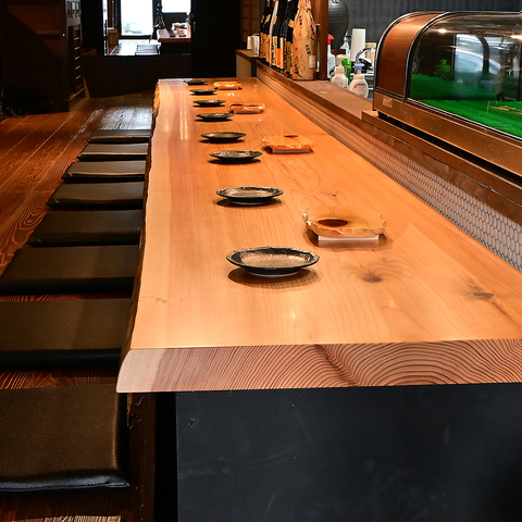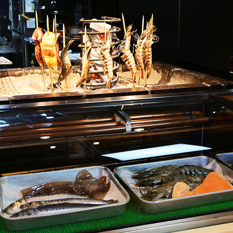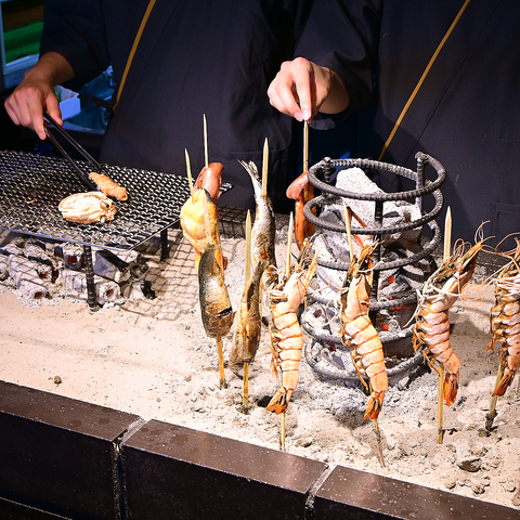 目の前で食材が炭火で焼かれる様子を見られるのが、炉端焼きの魅力です。炭火の香り、焼ける音、立ちのぼる煙―すべてが五感を刺激し、食欲をそそります。調味は最低限に、炭火でじっくり焼き上げることで、魚介類・野菜・肉などの素材本来の味を堪能できます。新鮮な食材の旨味をご堪能ください。