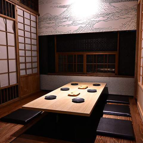 個室席もございます。和の落ち着きと品格のある個室は掘りごたつ式の座席で足を伸ばせて快適、長時間でも疲れにくく、会食や接待にも最適です。壁の山並みのアートが静寂の中に個性を添え、非日常の上質なひとときを提供してくれます。照明も柔らかく、心を和ませる空間美が魅力です。