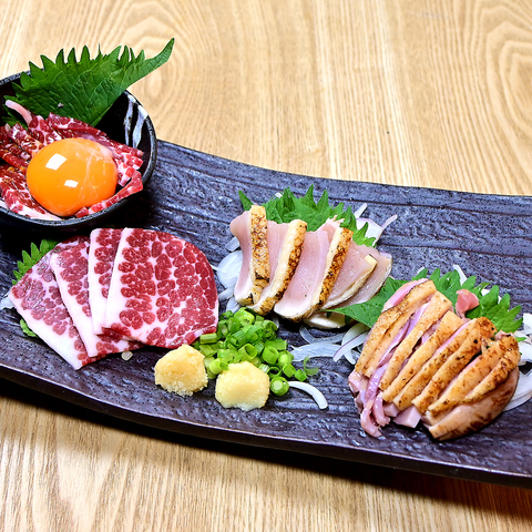馬肉や鳥刺しを堪能できる盛り合わせになります♪