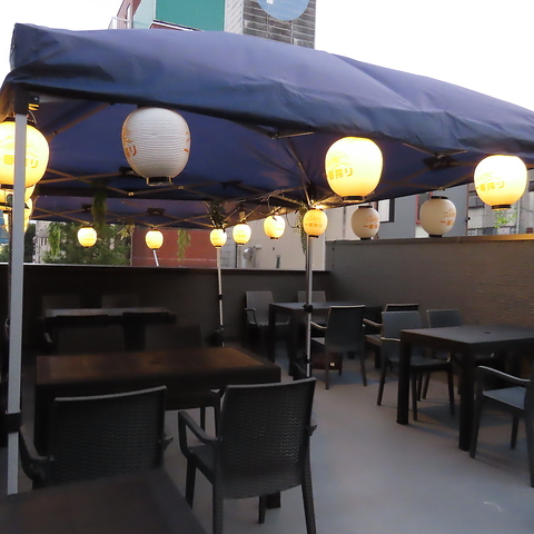 当ビアガーデンは、開放的な屋上にございます◎2階へと続く階段を上がると、そこには心地よい風が吹き抜ける特別な空間。日差しを遮る屋根も完備しているので、日中でも快適にお過ごしいただけます。夕暮れ時には提灯が灯り、少し懐かしさも感じる雰囲気に♪デートや女子会にも最適です!