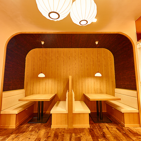 木の質感を生かした温かみのある半個室のテーブル席は、プライベート感と心地よさを兼ね備えた空間で、周囲とのほどよい距離感が心地よい安心感を生み出します。丸みを帯びたデザインと柔らかな照明が、上品な雰囲気を演出しており、和の要素をモダンに取り入れた、落ち着いたひとときをお楽しみいただけます。