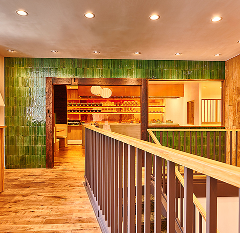 店内はホテルインレストランで高級感たっぷり。木の温もりと自然素材に包まれた、落ち着きのある和モダンな空間です。深い緑のタイルや和紙風の照明が、上質で静かな雰囲気を演出。モダンなデザインと伝統的な和の要素が調和し、心が穏やかになるような洗練された空間でお食事をお楽しみいただけます。