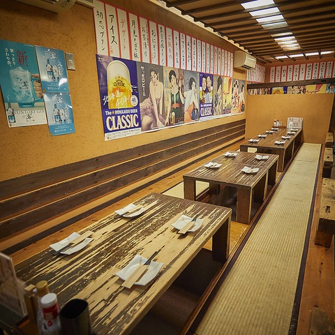 団体席から少人数様までと幅広いニーズに応えられるお席を用意しております。定期的な空気の入れ替えを行い卓上にはアルコールジェルも用意しております。周りの目を気にせずゆったり楽しいひと時をお過ごしください。大人数の宴会にも対応可能な座敷席をご用意しております。