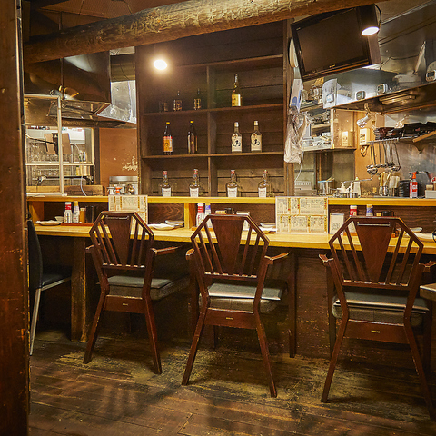 ▼カウンター。ライブ感あるカウンター席で、博多の名物料理を味わいながら、目の前で焼き上げる串や餃子を眺められます。少人数やデートにもぴったりの席で、充実したひとときをお過ごしください。