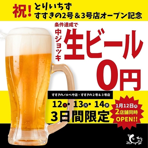 1/12~1/14までの3日間、グループ全員が簡単な条件達成で、何杯飲んでも生ビール0円!!※利用条件あり