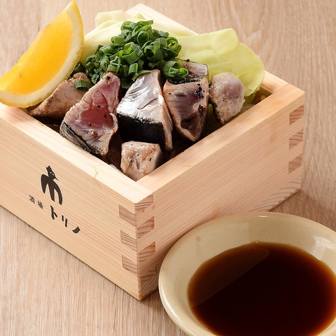 プリプリのカツオにしっかり炭の香りが染み渡る一品!お好みでレモンやポン酢をつけてお召し上がりください。