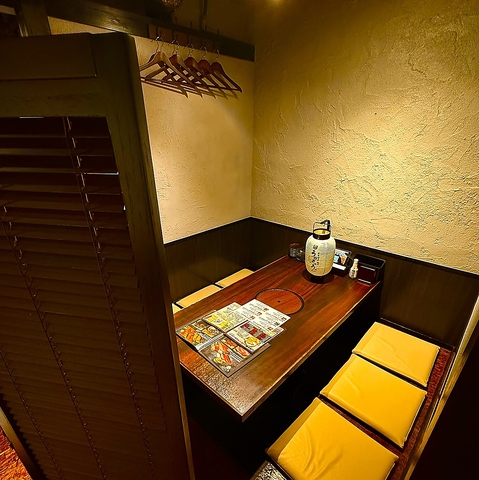 《少人数でもお楽しみ頂けます》2~4名様用の暖簾個室もございます。デートやお友達同士などの少人数でのお食事にぴったり。プライベートな個室空間でゆったりと語り合いながらお食事やお酒をお楽しみ頂けます。