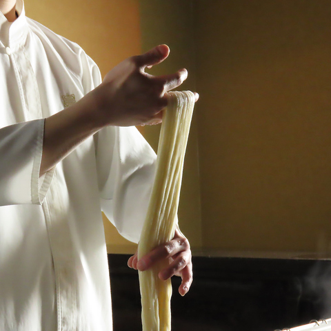職人が粉からこだわり、丹精込めてうどんを手打ちする姿からは、本物の味への情熱が伝わります。福岡産小麦の豊かな香りが漂う中、その日の気温や湿度に合わせて微調整しながら打つ自家製麺。一杯一杯に込められた熟練の技と想いを、ぜひ舌で感じてください。出来立てならではの極上のコシと喉越しをお約束します。