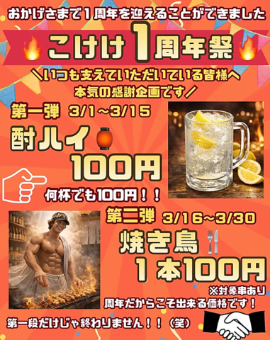 3月でこけけの1周年!皆様への感謝企画として、前半は酎ハイが100円、後半は指定の焼き鳥が一本100円に!