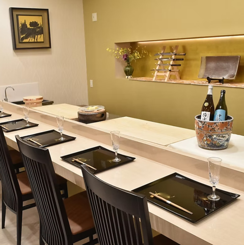 落ち着いたカウンターが、上質な和の雰囲気を演出します。目の前で提供される旬の料理と、それに合わせた美酒を、ゆっくりと、誰にも邪魔されずに味わう贅沢。