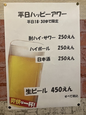 月~土、祝前日: 17:00~23:00 (料理L.O. 22:00 ドリンクL.O. 22:30) 祝日: 17:00~22:00 (料理L.O. 21:00 ドリンクL.O. 21:30) |