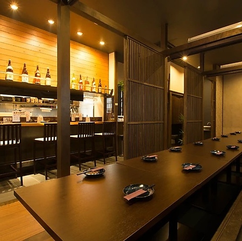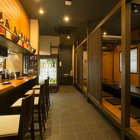 | カウンター | 2名様×2 | 木の温もりが感じられるカウンターは、一人飲みや二人飲みのシーンにぴったりです。中央にはロールスクリーンもあるので、カウンターながらプライベートな空間でお過ごしいただけます。 |
