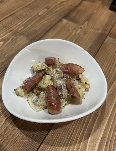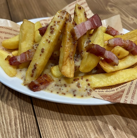 ソースや具材をトッピングしたフライドポテト ・ハニーマスタード&まきさわ工房ベーコン ・チリコンカン ・チーズ ・チリコンカン&チーズ