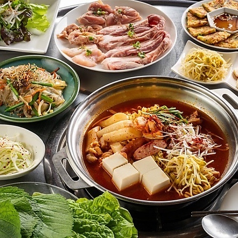 【サムギョプサル】+【プデチゲor海鮮鍋】など全8品+飲み放題付きお得なコース!!!コースの鍋は、甘辛ベースのスープにトッポギ・ラーメン・チーズなどが入った「プデチゲ」。塩味ベースのスープに海鮮の旨みがギュッと詰まった「海鮮鍋」。お好きな方をお選び下さい。