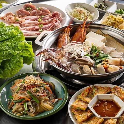 空コース★【プデチゲor海鮮鍋】+【サムギョプサル+サンチュセット+国産鳥3種焼き+アラカルト4品+アルコール飲み放題】のお得な空コース! 空コースは3hアルコール飲み放題付きです!※お手数ですが、陸海空コースをご利用の方はご予約時「プデチゲ」もしくは「海鮮鍋」お好みの鍋を1つご記入ください。