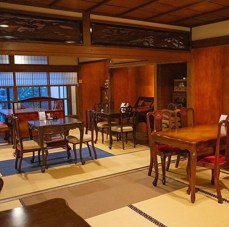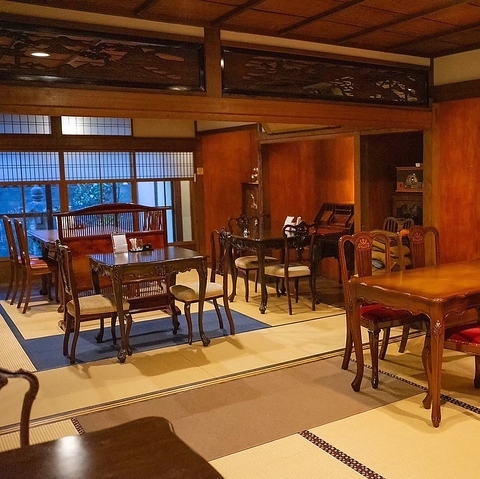 最大35名収容可能な広々した1F席。大正ロマンの空間にアンティーク家具を揃えております。