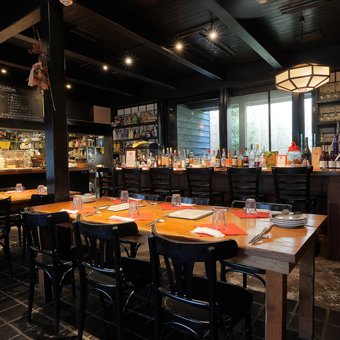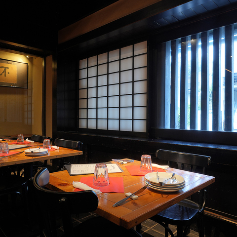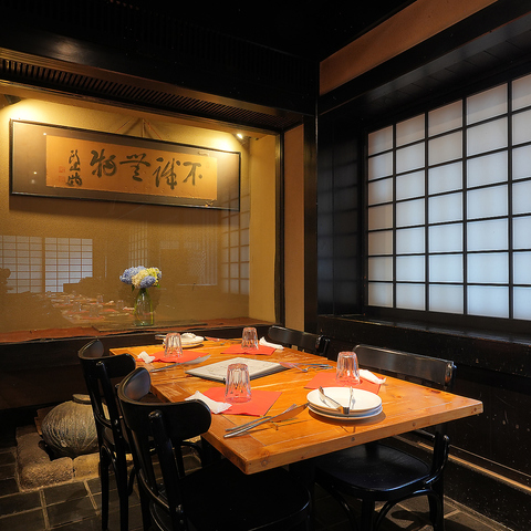 古民家を改装した店内は、和の落ち着きとモダンな感性が融合した空間。ふすまや黒基調の内装が日本料理店を思わせる洗練された雰囲気で、静かに流れる時間を演出します。貸切対応も可能なため、少人数の集まりから中規模な会食まで幅広いシーンに対応。木の温もりとシンプルな照明が心地よく、訪れる人を包み込む空間です。