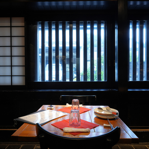 古民家ならではの落ち着いた設えに、自然と会話が弾む4名席。料理が次々と提供されるコースディナーにも対応しやすく、ゆっくりとコース料理を楽しむのに適した座席です。お祝いの食事にもおすすめです。