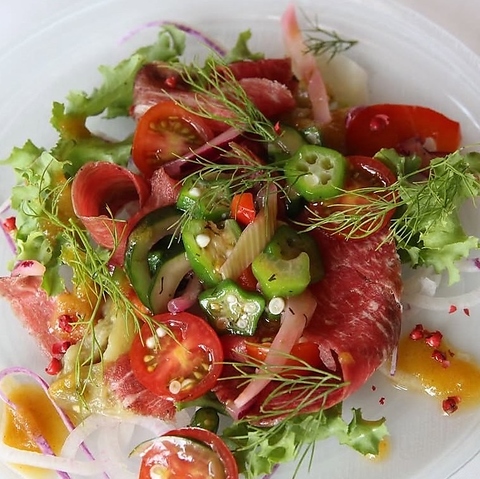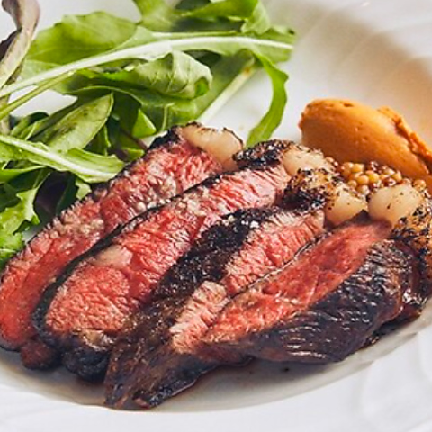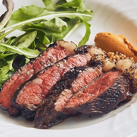 滋賀県の精肉店「サカエヤ」で大切に手当てされた「熟成黒毛和牛」は、当店が自信をもってご提供するこだわり食材。シンプルに塩で味付けをし、ベストな火加減でカリッと焼き上げることで、肉質の良さを最大限に引き出します。力強い旨みと奥深い味わいをぜひご堪能ください。スペシャルコースでは、+1,100円でメインのお肉を熟成黒毛和牛サーロインに変更可能。アラカルトでもご用意できますので、お気軽にご用命ください。