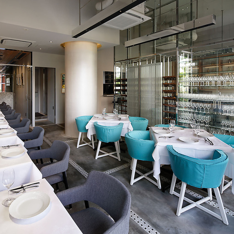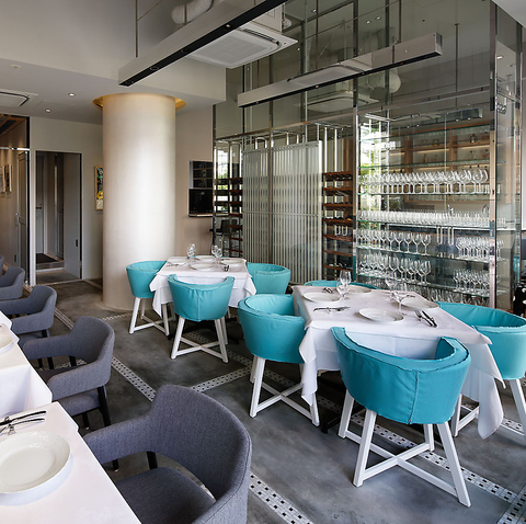 ティファニーブルーを基調とした洗練された空間。心地よいひとときをお過ごしください