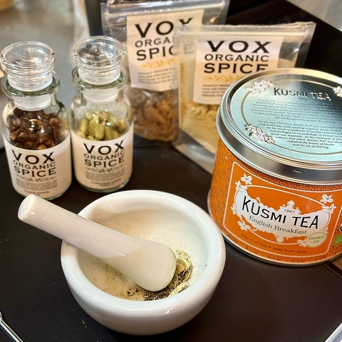 マサラチャイはスパイスをブレンドしたオリジナルで、ガツンとパンチの効いたチャイに仕上げています。紅茶の茶葉はオーガニックですが、抹茶やほうじ茶などの茶葉も無農薬、無化学肥料で丁寧に作られたものを使用しているため、ゆっくりとしたカフェタイムを安心してお過ごしいただけます。