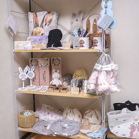 お店にはうさぎちゃんグッズの販売スペースもご用意しております。うさぎオーナーさん必須のうさぎさんのおやつやペットシート、キャリーから、ハンドメイドのうさぎのぬいぐるみやキーホルダー、バッグまで幅広く用意し、その時々で可愛い商品を販売しております。当店に来た記念のお土産にご検討ください☆
