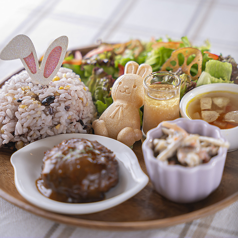 ヘルシーな雑穀米、ジューシーなハンバーグ、無農薬野菜を使用したサラダ等がセットになったボリューム満点のランチプレート♪栄養バランスも考慮されており、美味しさと健康を両立☆見た目も可愛いので見て楽しい、食べて美味しい♪無農薬野菜は飼っているうさぎさんと一緒に食べられるのも嬉しいポイントです◎