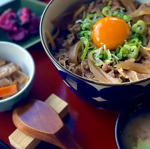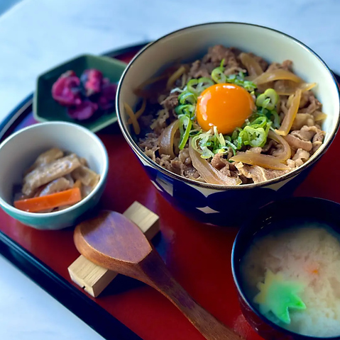 (牛めし/味噌汁/小鉢/漬物)牛めしは、ご飯の上に醤油の香ばしいタレと牛肉と玉ねぎがたっぷりと乗った、心温まる日本の伝統的な料理です。