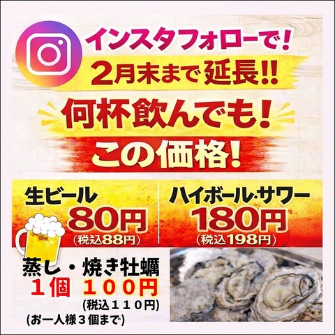 インスタフォローの画面見していただくと生ビール何倍飲んでも88円になります!牡蠣はなんと1個110円!