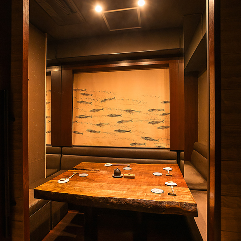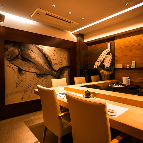 温もりある木目と落ち着いた照明に包まれた空間で、洗練された中にも心地よさを感じさせる内装が魅力。壁に描かれた魚のアートも印象的で、視覚的にも楽しめます。高級感はありながらも堅苦しさはなく、誰でもリラックスして過ごせるような設計。大人の隠れ家のような雰囲気が漂う空間で、素敵なひと時をお過ごしください。
