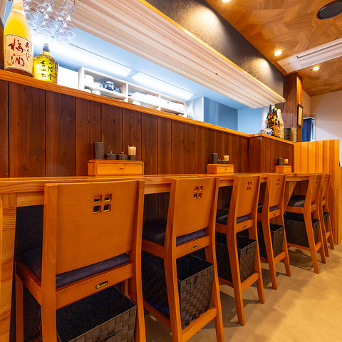 お一人様やデートでのご来店に最適なカウンター席は6席ご用意!一般的な焼き鳥店には焼き場にガラスのパーテーションが施されていますが、元輔ではお客様とのコミュニケーションをお楽しみいただけるオープンな焼き場となっております◎ダクトは焼き場に設置しているため煙やにおいも気にせず安心♪