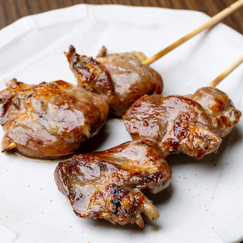 1本1本丁寧に串打ちし、炭火で香ばしく焼き上げる『つくね』。鶏と鴨の合い挽きに軟骨を混ぜ合わせ、さらに味噌などを混ぜ合わせて仕上げたつくねは、食感のコントラストと溢れる旨味が堪りません♪塩・タレの他チーズ乗せなど、バリエーションも豊富!