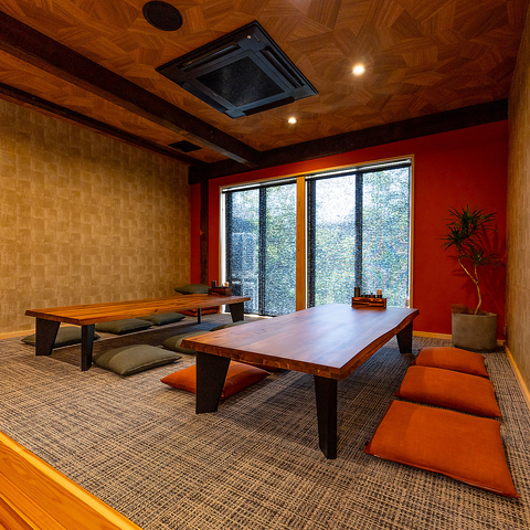 中庭の見えるお座敷席もご用意しております。6名掛けテーブルの2つ並んだ座敷は、団体様のご宴会シーンやお子様を連れてご家族でのお食事シーンにもぴったり。ゆったりとくつろぎながらお食事をお楽しみいただけます。駐車場もございますので、お車でのご来店も可能です◎