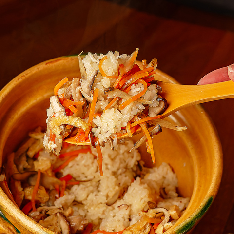 鶏肉を主役にしたかしわ土鍋飯は、土鍋でじっくりと炊き上げることで、ふっくらとしたお米と鶏肉の旨味、野菜の甘みが絶妙に絡み合う、心温まる一品です。一口食べると、具材の風味が口いっぱいに広がり、食欲をそそります。