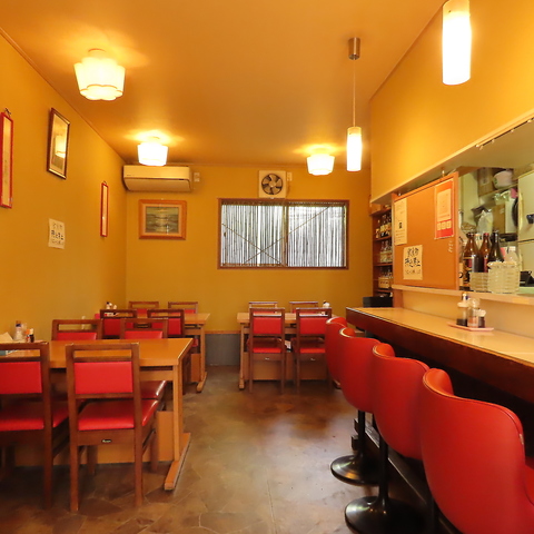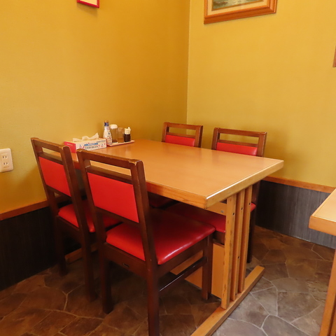 テーブル席は、落ち着いた雰囲気が魅力です。赤い椅子が印象的なこのスペースは、友人や家族とくつろぎながら食事を楽しむのに最適。シンプルで温かみのある内装が、心地よい食事の時間を演出します。
